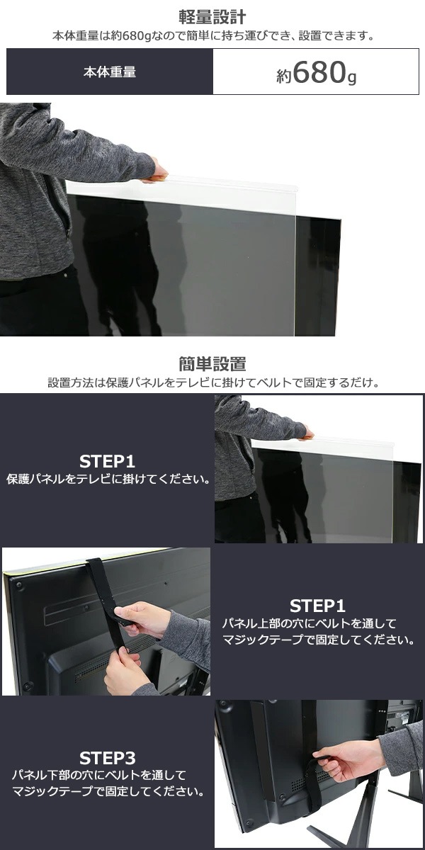 ■設置方法はパネルをテレビに掛けてベルトで固定するだけで簡単に設置できます。
